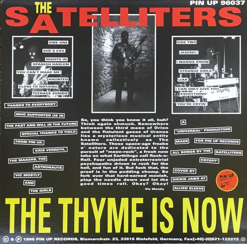 LAST WEEK’S DUSTY DIAMOND (a forgotten gem from the STD vaults): The Satelliters are a garage rock band from Darmstadt, Germany, and have been active since the mid 90s. They have a 60s inflected sound with twangy (often surfy) guitar, prominent keyboards, and snarling vocals. “She’s Evil” is a brooding mid-tempo burner with nifty psychedelic wah wah effects. The singer’s occasional piercing, anguished screams reinforce the main idea of the song: his woman is no good. It appeared in 1996 on their “The Thyme Is Now” album on Pin Up Records. Listen to it below: