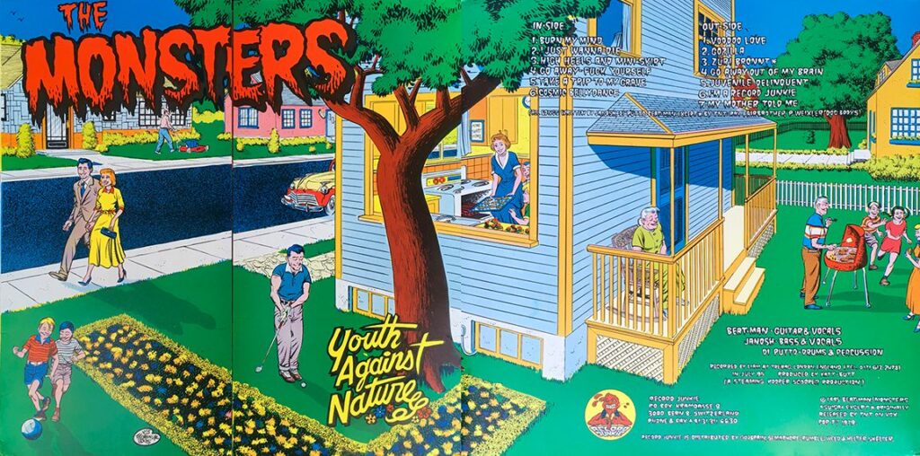 PICTURE SLEEVE OF THE WEEK: The Monsters, a Swiss garage punk band (and previous Dusty Diamond), released “Youth Against Nature” in 1995 on the Record Junkie label. It features the work of the prolific Canadian cartoon artist Darren Merinuk. He was a favorite among 90s garage and punk bands, and continues to do cover and comic book art. Much of his work is heavily influenced by the EC and Marvel Strange Tales comics of the 50s. This “Youth Against Nature” album is a limited edition of 300 on red translucent vinyl, and comes in a spectacular fold-out cover. The outer sleeve depicts an idyllic suburban neighborhood scene, while the inner switches to a gruesome nightmare scene, replete with crazies, corpses and lots of blood. The album also comes with a cool poster and a Monsters “Voodoo Sex Coffee” trinket. Watch my show and tell in the video if you care to see the somewhat disturbing inner sleeve.