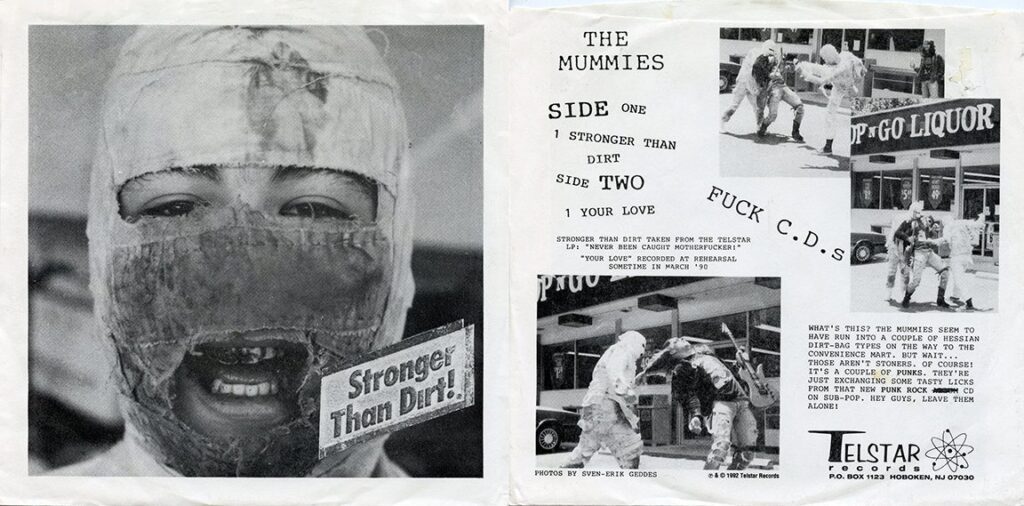 PICTURE SLEEVE OF THE WEEK: This is the record that gave the show its name. The Mummies were from San Bruno CA (near San Francisco) and played garage punk while dressed in ragged mummy costumes. While together for only a few years (1988-1992) their lo-fi sound, stage costumes, and general rebellious attitude (“F— CDs”) were a major influence on the 90s garage scene. The “Stronger Than Dirt” single featured (as did many of their releases) photos by Sven-Erik Geddes, owner of the garage label Planet Pimp Records. It appeared in 1992 on the Telstar label.