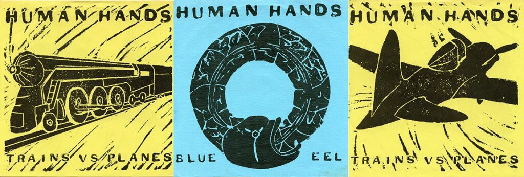 PICTURE SLEEVE OF THE WEEK: Human Hands are a rock band based in Los Angeles who started in the early 80s as a post punk band. Their first release, the “Trains Vs Planes” single, was released in 1980 on Faulty Records, the U.K. holding company for I.R.S. Records. It came with two double sided 7″ square inserts, which serve as the cover, and featured artwork by their keyboardist, Bill Noland. He went on to join Wall of Voodoo in late 1982. Click on image to enlarge.