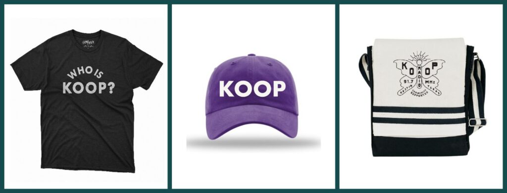 What better way to let people know that YOU are KOOP with one of these fantastic gifts: a Who Is KOOP T-shirt, a royal purple embroidered KOOP hat, and a messenger bag big enough to carry your favorite vinyl everywhere you go. Let us know YOU are KOOP and donate now!