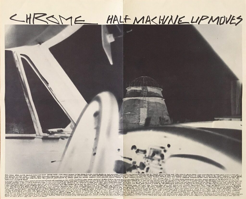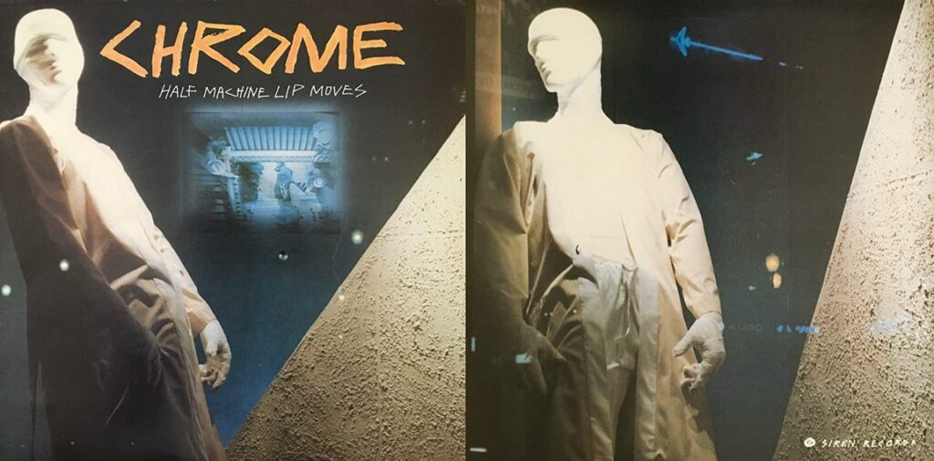 COVER ART OF THE WEEK: Chrome were a rock band from San Francisco whose music combined elements of punk, industrial, and psychedelia. They were active mainly in the late 70s and early 80s. Their third studio album, “Half Machine Lip Moves,” is a masterwork of early industrial rock. Released in 1979 on Siren Records, its front and back covers featured photos (of band members Gary Spain and Damon Edge) and special effects by Amy James. It came with a foldout poster with photo and design by Edge (real name Thomas Wisse). He also helped with the front cover’s art direction. Click images to enlarge.