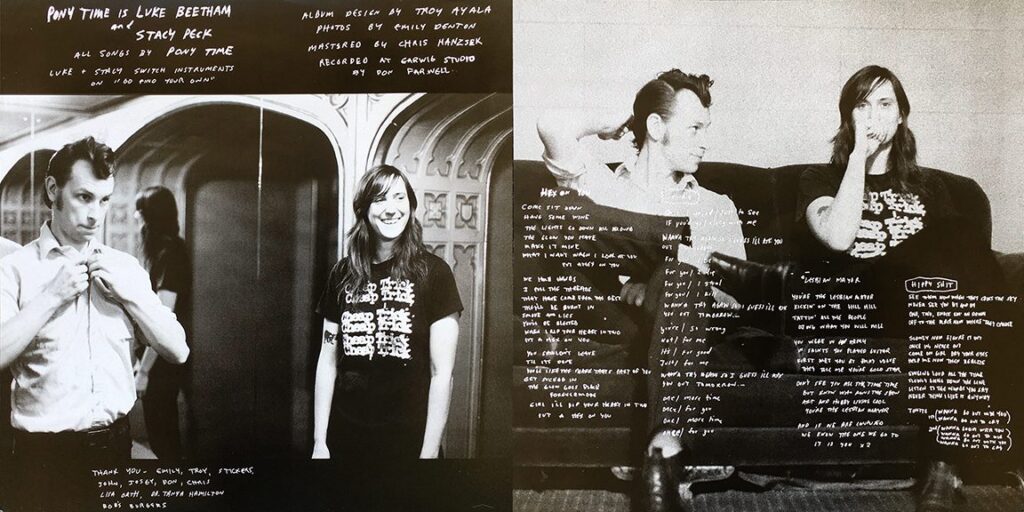 COVER ART OF THE WEEK: Pony Time are a two-piece garage band from Seattle that had several releases in the early to mid 2010s. Their first full-length album, “Go Find Your Own,’” featured cover art and design by Troy Ayala. It also included an insert with band photos by Emily Denton. It was released in 2013 on Per Se Records. Click on images to enlarge.