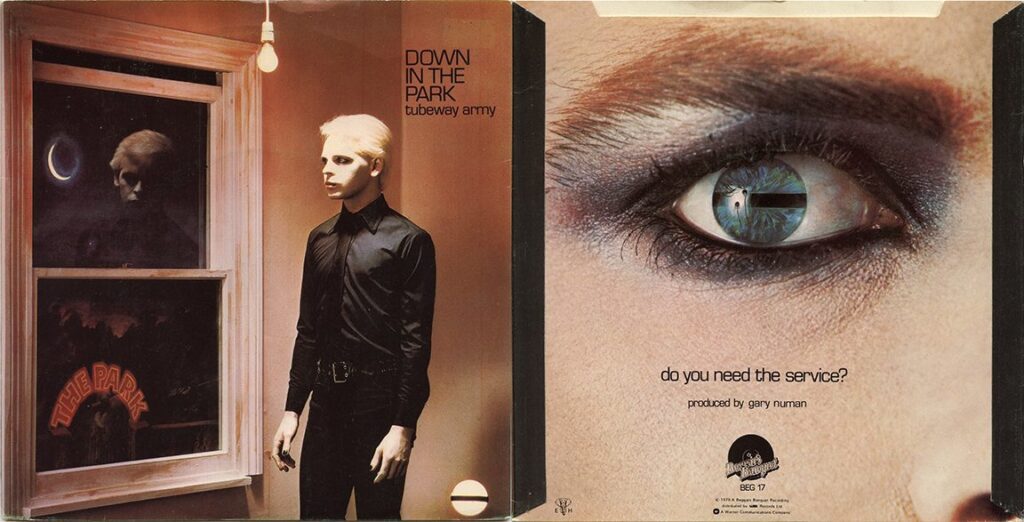 COVER ART OF THE WEEK: Led by Gary Numan, UK band Tubeway Army was one of the first ’77 era bands to embrace synthesizers. Their second album, “Replicas,” was released in 1978 on Beggars Banquet and included the two singles, “Down in the Park” and the huge hit “Are ‘Friends’ Electric?” Both of those used the same cover art as the album, which featured art direction by Malti Kidia and photography by Geoff Howes. Shortly after the release of the latter, Numan chose to drop the “Tubeway Army” name and release music under his own name, albeit with the same backing band. (Click on image to enlarge.)
