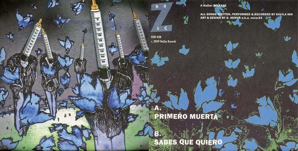 COVER ART OF THE WEEK: Davila 666 are a garage rock band from San Juan, Puerto Rico. They have been around since the mid 00s and have released several singles and albums. Their second single, “Primero Muerta” b/w “Sabes Quiero” was released in 2009 on Hozac Records in four separate editions. Three of the editions featured the same artwork (shown here) by Nemyr (AKA once23) and came on different colored vinyl, black, red, and green. The fourth edition had different artwork and came on gold vinyl. (Click on image to enlarge)