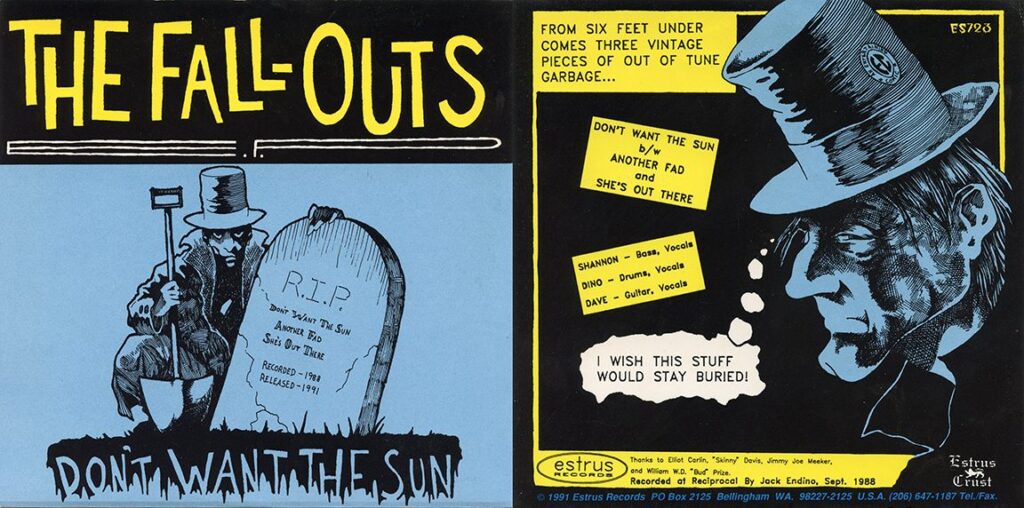 DUSTY DIAMOND OF THE WEEK (a vintage gem from the STD vaults): The Fall-Outs, a seminal garage band from Seattle, remain one of my favorites from the 80s and 90s. They released a cassette album in 1986, but it wasn’t until the 90s that they received more attention through releases on the Estrus and Super Electro labels. In 1991 Estrus released the “Don’t Want the Sun” EP, a collection of three songs that had been recorded in 1988. The titular song is an up-tempo burst of blistering guitar, loping bass and anguished vocals, in other words, classic Fall-Outs. Listen to it here: