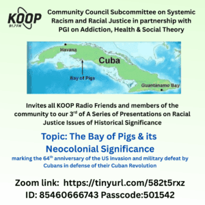 The KOOP Community Council Subcommittee on Systemic Racism and Racial Justice is presenting their 3rd Zoom presentation and dialogue on The Bay of Pigs & Its Neocolonial Historical Significance. April