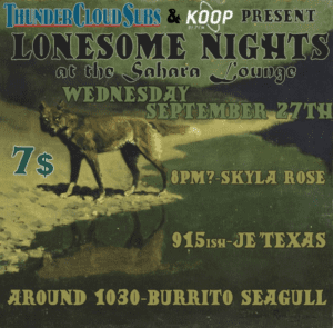 KOOP Radio & Thundercloud Subs Present: Lonesome Nights! Featuring:Skyla RoseJe’TexasBurrito Seagull Wednesday, September 27th 7pm – Midnight at the Sahara Lounge. Details at Do512