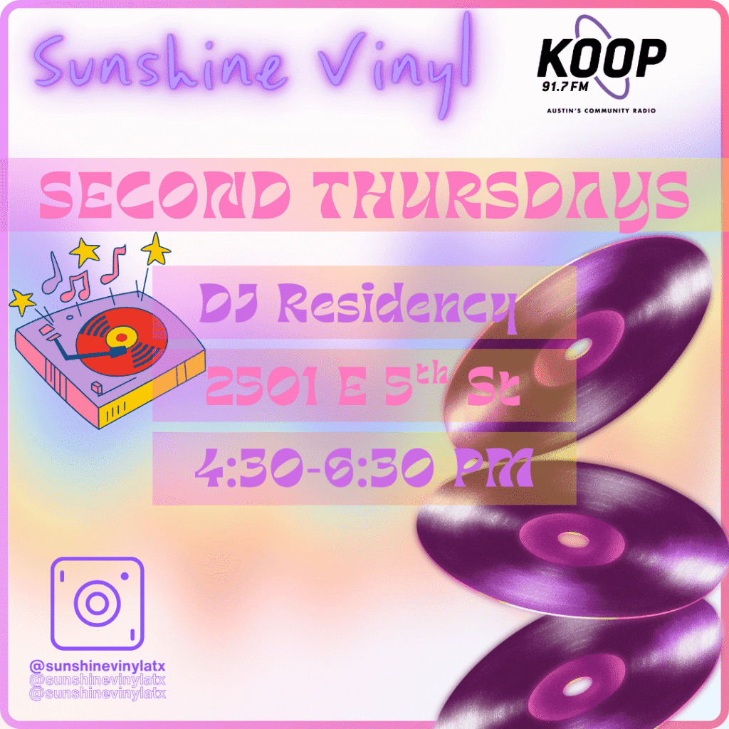 KOOP Radio and Sunshine Vinyl are joining forces to bring you all-vinyl DJ sets on the second Thursday of each month from 4:30pm-6:30pm.