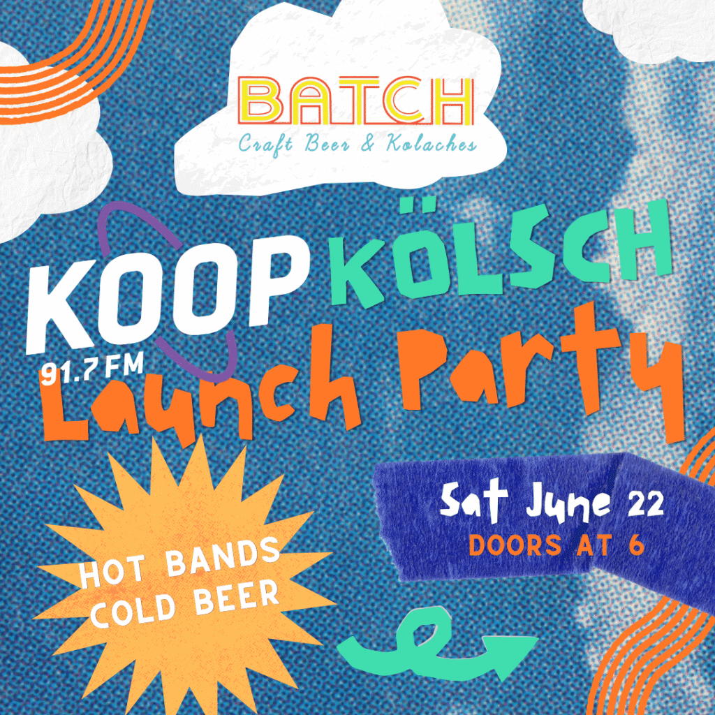 Join us Saturday, June 22nd from 6-10 pm at Batch and you’ll get the first chance to purchase the beer (a portion of every kolsch sale goes to KOOP!) and enjoy some live music from local acts: