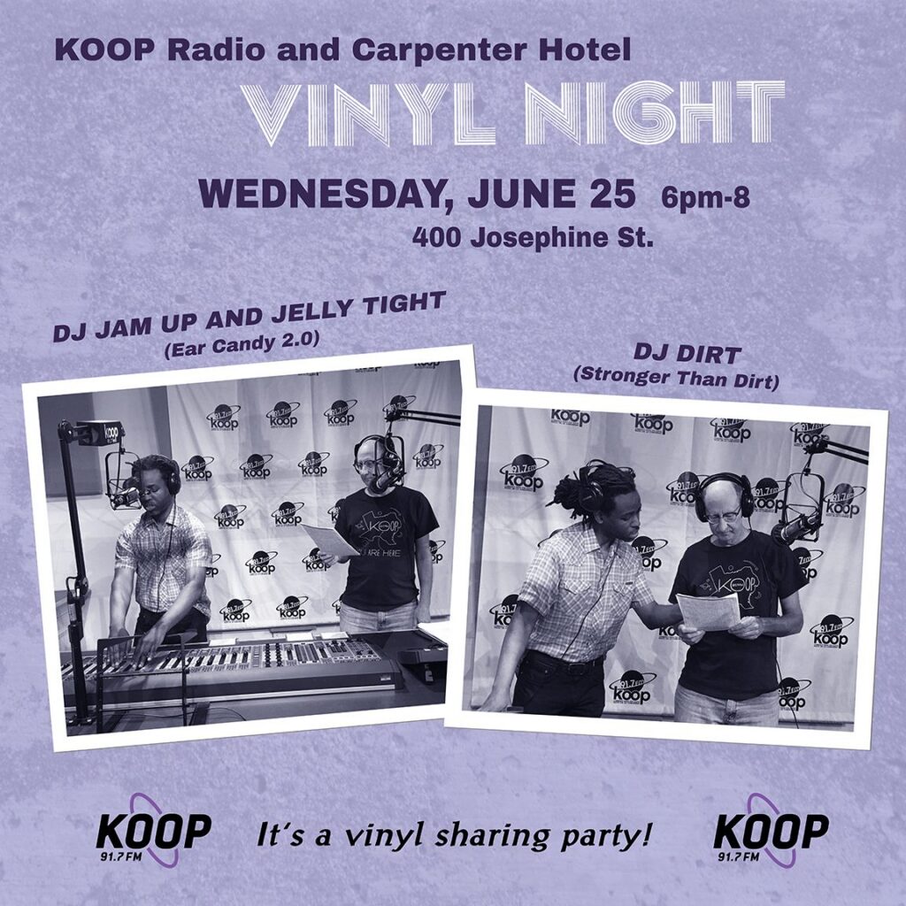 KOOP’s monthly Vinyl Night is back at the Carpenter Hotel on Wednesday, June 25. KOOP’s DJ Jam Up and Jelly Tight (Ear Candy 2.0) and DJ Dirt (Stronger Than Dirt) will be your hosts for a night of vinyl sharing. Bring your own records, browse the Carpenter library, or just come to hang and enjoy the tunes. The fun starts at 6pm and goes until 8.