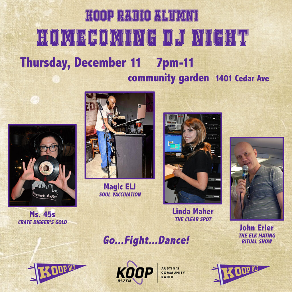 KOOP Radio’s monthly DJ Night returns to community garden on Thursday, December 11 with a very special Homecoming edition. KOOP DJ alumni John Erler from The Elk Mating Ritual Show (and Master Pancake Theater), Linda Maher from The Clear Spot, Edward Johnson AKA Magic ELJ from Soul Vaccination and Carla Shiflet AKA Ms. 45s from Crate Digger’s Gold will be spinning tunes from 7pm to 11. There’s no place like home, and no place like KOOP!
