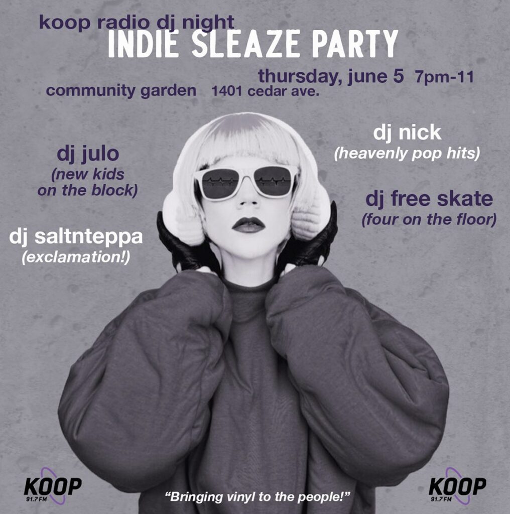 Indie sleaze is coming to June’s KOOP DJ Night at community garden! DJs Free Skate (Four on the Floor), Nick (Heavenly Pop Hits), JuLo (New Kids on the Block) and Saltnteppa (Exclamation!) will be serving up platters of indie sleaze from the naughty aughts from 7pm-11pm. Can we hear a Yeah Yeah Yeah?!